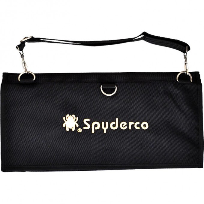 На сумке имеется регулируемый ремень, с помощью него сумку можно вешать на стену или носить через плечо. Фирменный логотип Spyderco вышит золотой нитью на закрывающем клапане сумки.